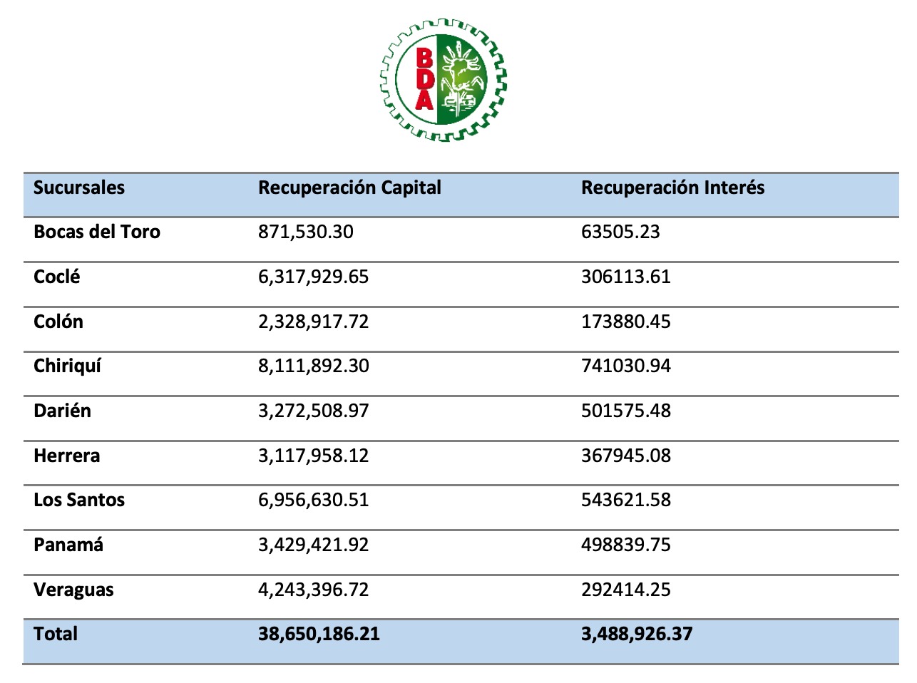 Un informe de la Gerencia de Crédito del BDA detalla que la recuperación a capital fue por el orden de 38,650,186.21 millones de enero a diciembre del año pasado y la recuperación en cuanto a intereses alcanzó la cifra de 3,488,926.37 millones de balboas.